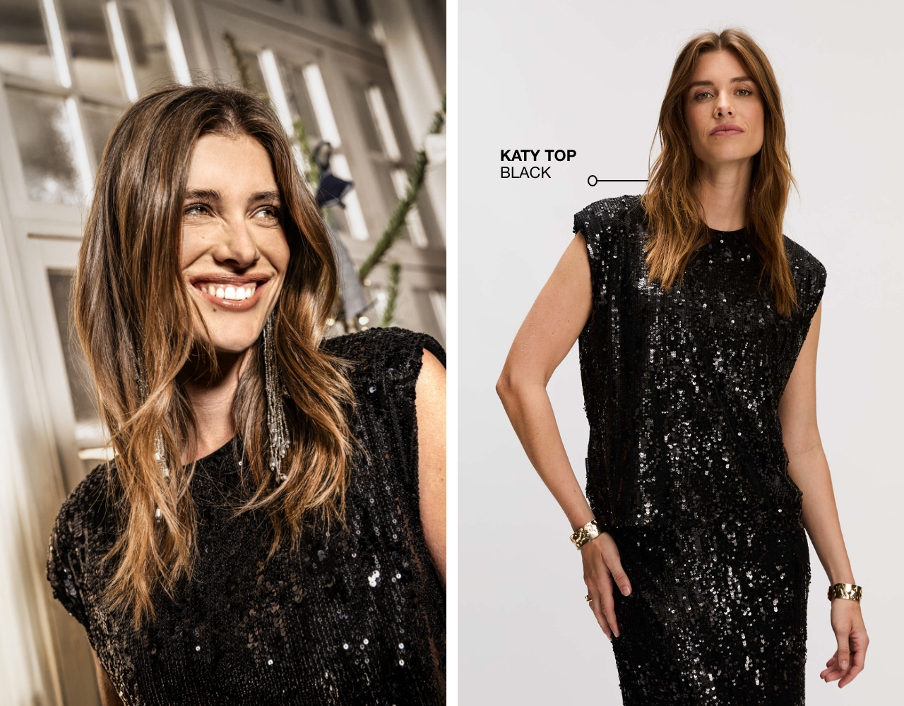 De Katy Top is deze maand ons absolute feestfavoriet. De all-over pailletten print geeft de look een feestelijke touch. De schoudervulling maakt het silhouet krachtig, waardoor je meteen een statement maakt.