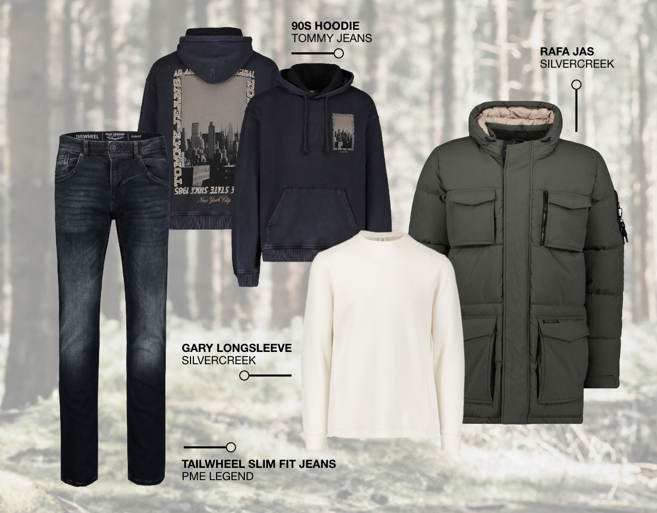 De tweede laag is waar je outfit echt tot leven komt. Hier voeg je warmte toe, maar ook karakter. Een zachte trui, een hoodie of een tijdloos vest geeft je look direct een winterse uitstraling. Door te variëren met texturen en pasvormen blijft je outfit interessant. Een grovere trui gecombineerd met een straight jeans vormt een goede basis voor jouw alledaagse winterse look. Voor een iets stoerdere fit kies je voor een comfortabele hoodie met een loose fit jeans.