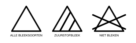 Een driehoek symbool staat voor bleken. Een lege driehoek betekent dat alle bleeksoorten zijn toegestaan, twee diagonale lijnen alleen zuurstofbleek, en een doorgekruist driehoek verbiedt alle bleekproducten.